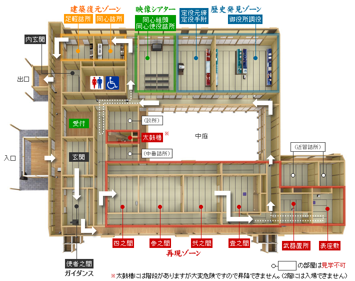 - 障子や襖など当時のままの復元施設のため、館内での飲食を禁止しています。
